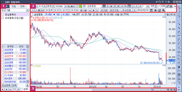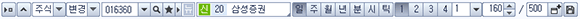 하단메뉴차트 하단에서는 현재 조회차트의 이전차트를 조회하기 위한 스크롤바 및 차트 확대바와 각종 기능버튼이 배치되어 있습니다.