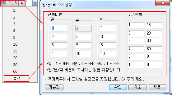 분차트기능 : 주기를 분으로 설정시 봉/1일/5일/20일을 선택하여 해당되는 기간의 봉수를 표시합니다. 보다 긴 기간을 조회하시려면