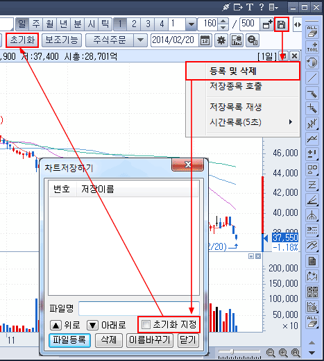 설정하신 차트를 저장하시면서 '초기화 지정' 을 체크하시면, 해당 저장 환경이 '초기화' 버튼의 실행값으로 지정됩니다.