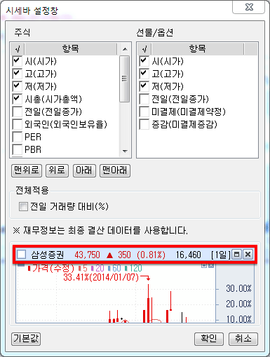 버튼을 클릭하면 시세바에 나타나는 정보를 설정 할 수 있습니다.