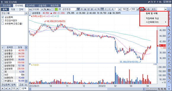 예를 들어 삼성증권 일봉에 추세선 작도 후 주기를 변경하거나, 종목 변경 후 다시 삼성증권 일봉으로 변경 시 기존에 작도했던 추세선이 보여지는 기능입니다.