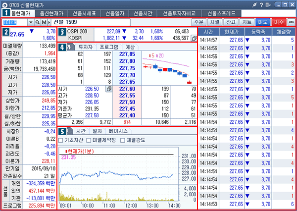선물종목의 현재가 및 호가, 투자자, 프로그램, 베이시스, 일자별/시간별 선물가와 시간별 체결내역등 종합적인 성격의 시세정보 조회 화면입니다.