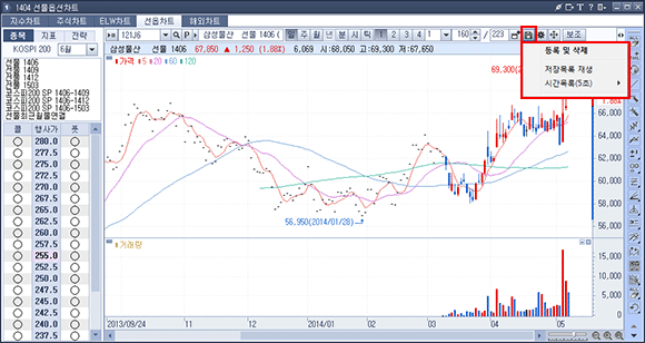 차트에 추세선 작도 시 추세선이 저장되어 '종목별/주기별(일/주/월/분)' 변경시 작도된 추세선이 기억되는 기능입니다.
