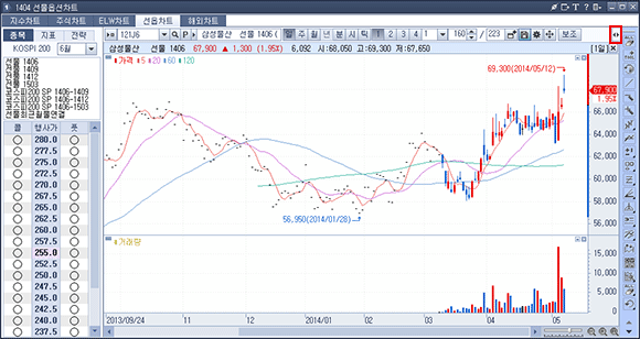 차트에서 우측툴바를 확대/축소하는 기능으로 우측툴바 왼쪽 버튼을 클릭하여 확대(보임)/축소(안보임) 기능을 실행할 수 있습니다.