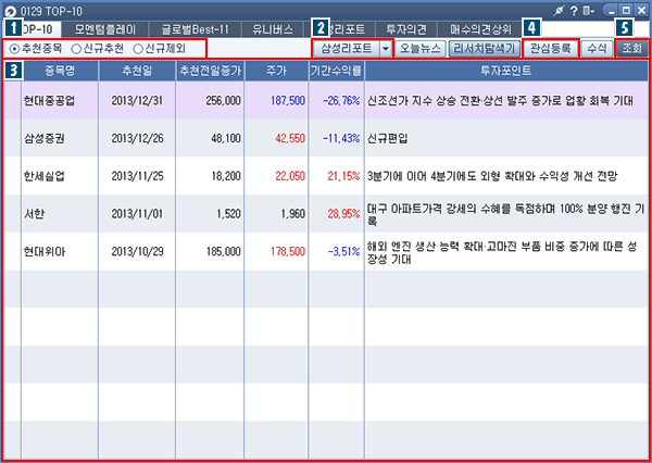 마우스로 종목을 선택하신 후 본 버튼을 클릭하시면 해당 종목이 관심종목 리스트 가운데로 삽입됩니다. |