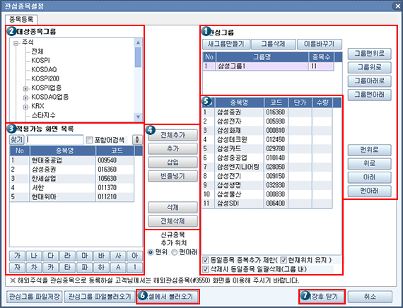 선택한 ‘대상종목그룹’에 속한 종목 전체를 관심종목으로 추가합니다. (단, 이때 관심그룹 당 종목수는 200개를 넘을 수 없습니다.)/td> |