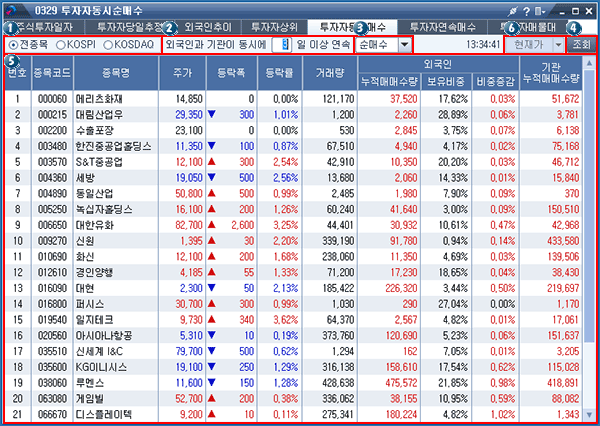 설정한 기간동안 외국인과 기관이 동시에 순매수한 종목 리스트와 각 종목별 외국인과 기관의 누적매매수량을 조회하실 수 있습니다. | ![]() |