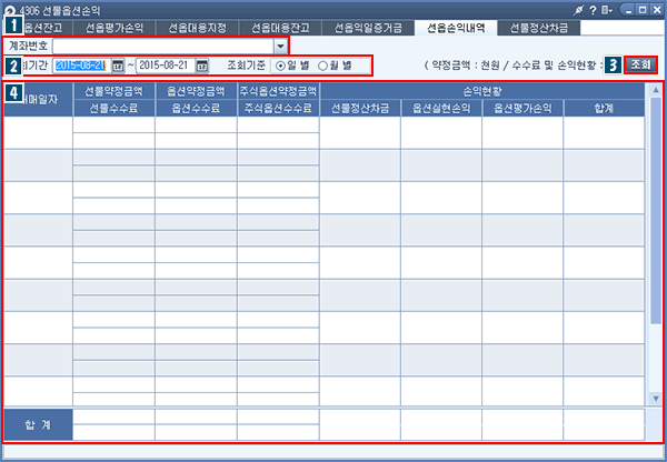 선물/옵션 계좌의 기간별 손익 및 수수료를 조회하는 화면 입니다.