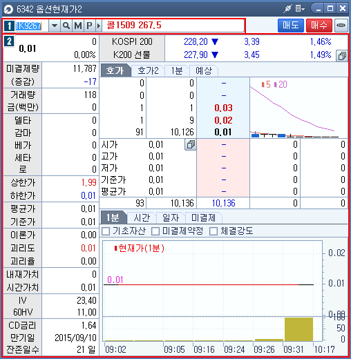 고객님께서 선택하신 옵션종목의 현재가 등의 시세정보, 델타 등의 옵션 민감도, 호가정보, 그리고 시간대별 체결내역을 조회할 수 있는 옵션의 가장 기본적인 화면입니다.
