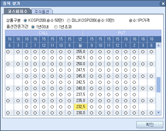 를 클릭하시면 '선물/옵션 찾기' 화면이 팝업되며, 주식선물옵션 종목을 선택할 수 있습니다. 또한, 선택하신 종목이 기본으로 표시됩니다.